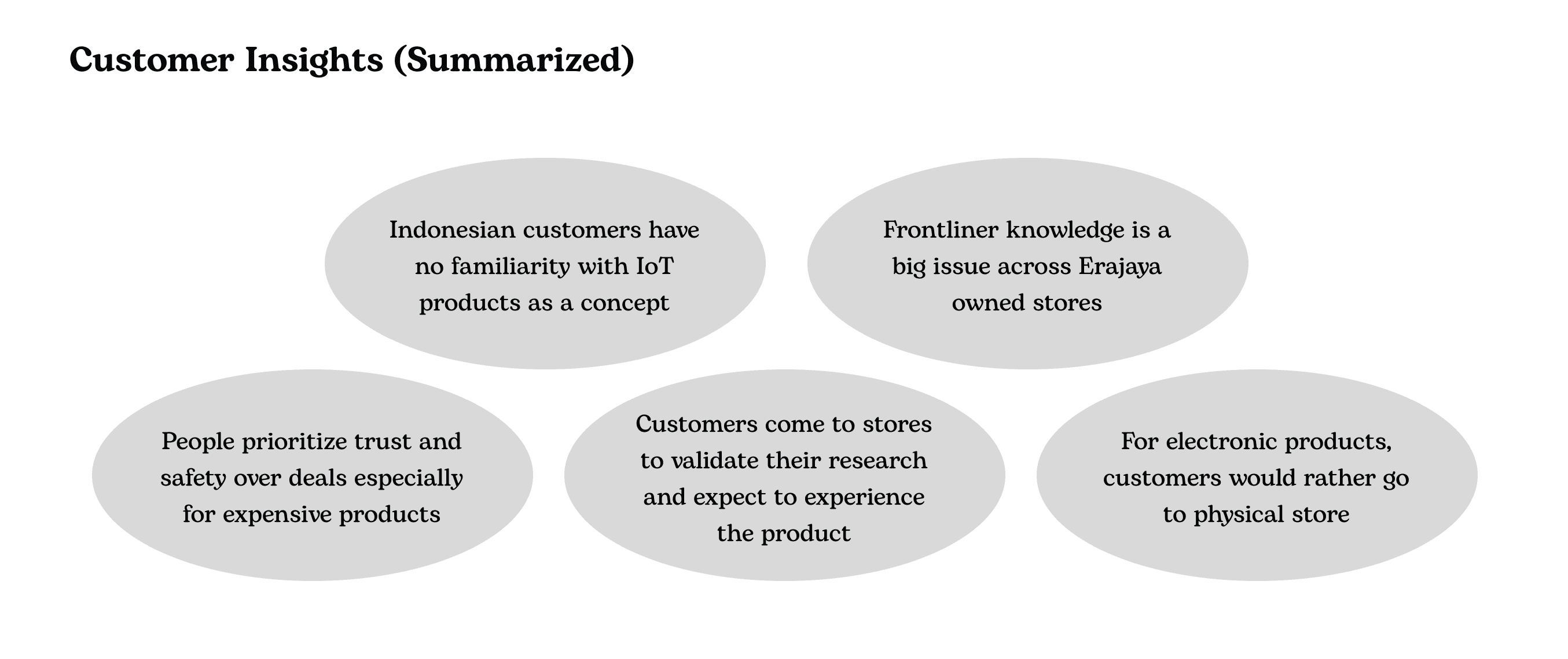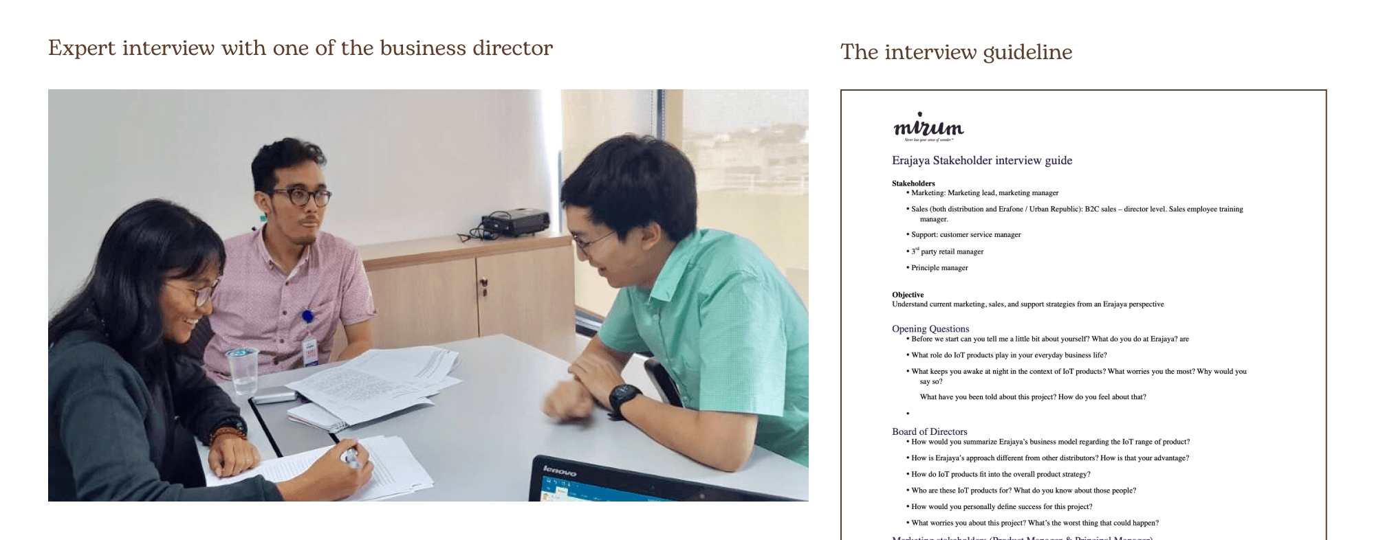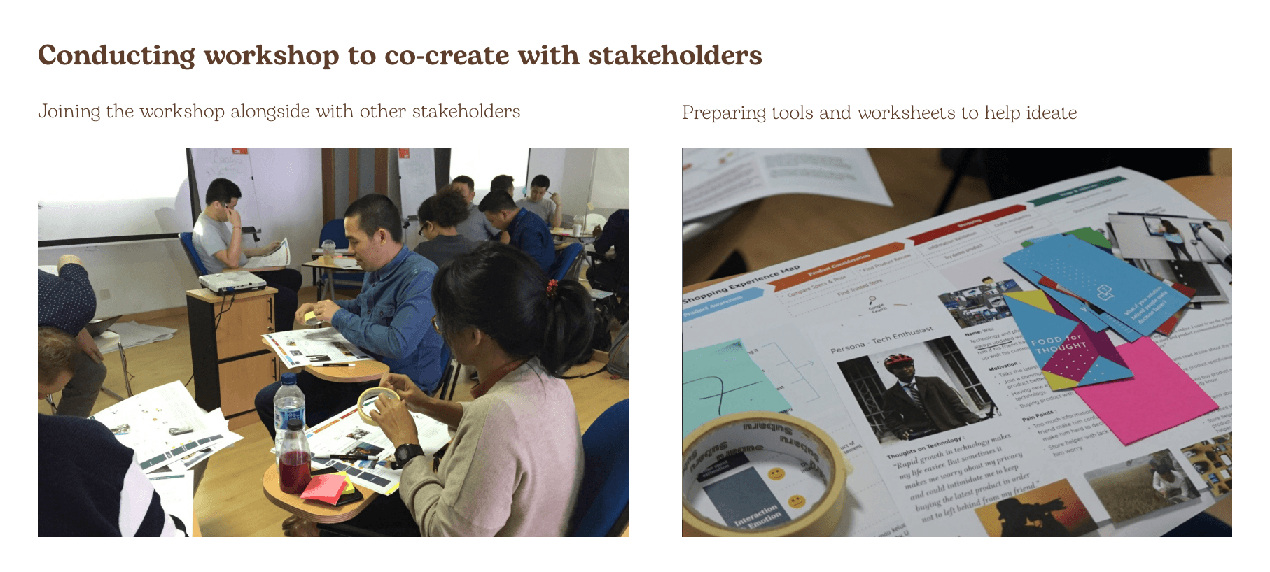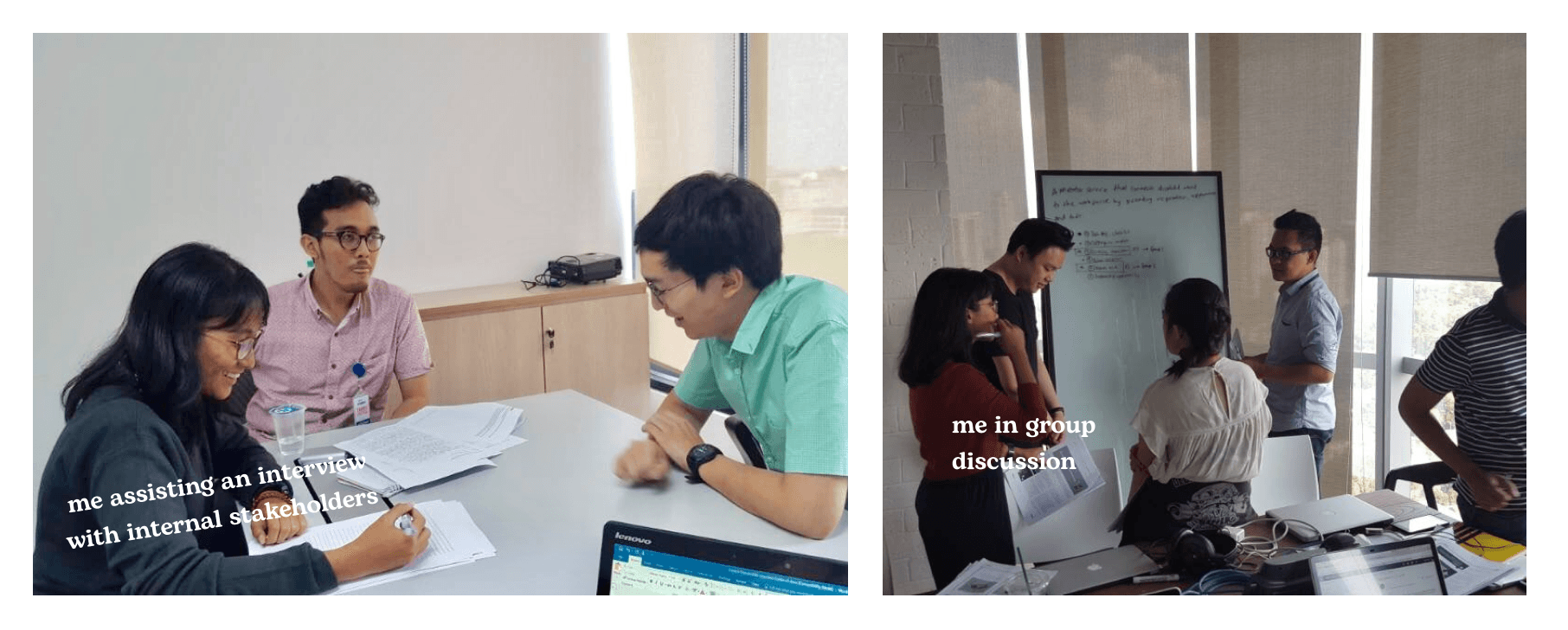 As an intern, my responsibilities revolved around supporting the core team in executing research, conducting in-depth interviews, creating research tools, and facilitating workshops with clients. Even though I was new to research, I had the privilege of being totally hands-on with the execution and involved in each discussion. The learning that I gained here has become one of my strongest foundation of research knowledge.