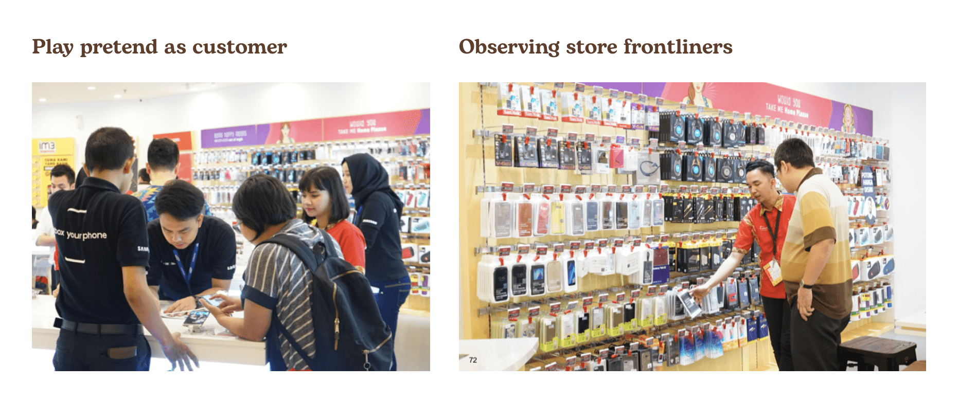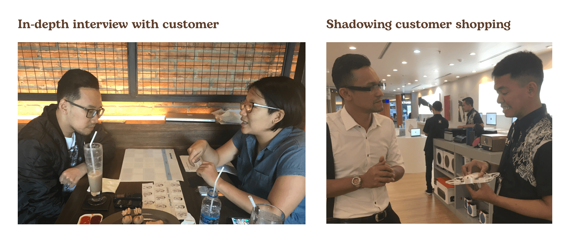 We conducted visual observations across our clients' brand stores and their competitors. This process was to understand what the current shopping experience feels like, providing us with a reasonable understanding of users and their activities in a short period of time.