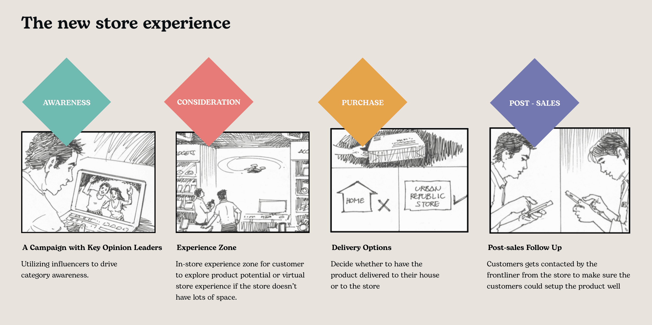 We proposed a new store experience in the form of a storyboard. There are many touchpoints along the customer's shopping experience where our client has the opportunity to demonstrate its new value proposition.