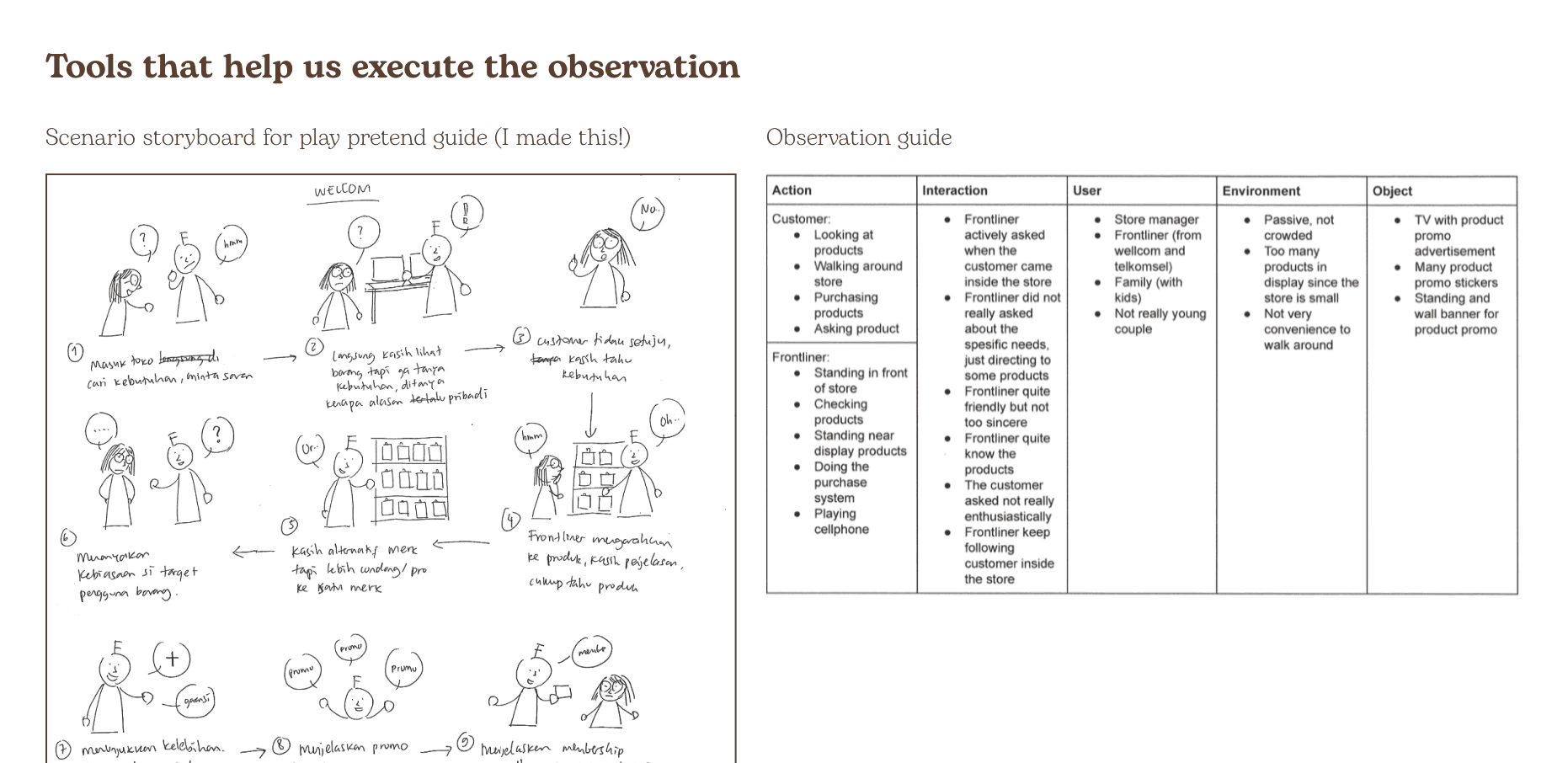 To better immerse ourselves in the experience, we pretended to be customers to see how the storekeepers would serve us in the actual scenario. We wore recording glasses and put a small recorder inside our pockets to record the conversations without their knowledge. This method helped us avoid distractions during observation and gain valuable findings from the field.